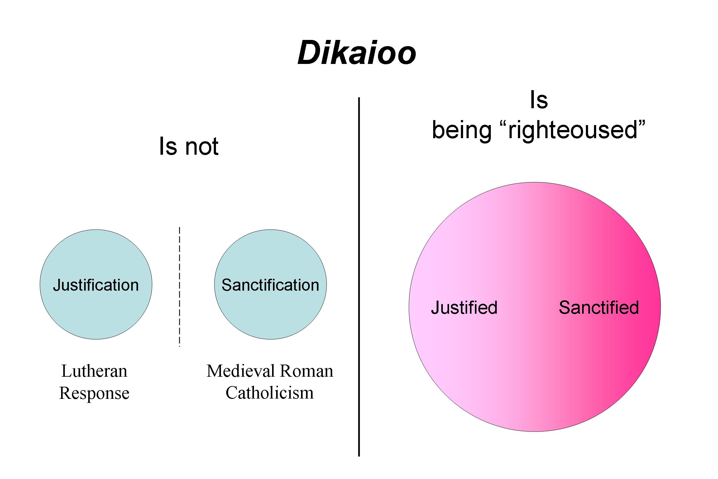 Yet, when we see justification and sanctification as expressions of righteousness, then no problem exists. For God not only works faith in our hearts (justification), He also works sanctification (the fruits of faith). (And although it’s true that we participate in our sanctification, this participation does not bring about the justifying aspect of being righteous [dikaioo]).