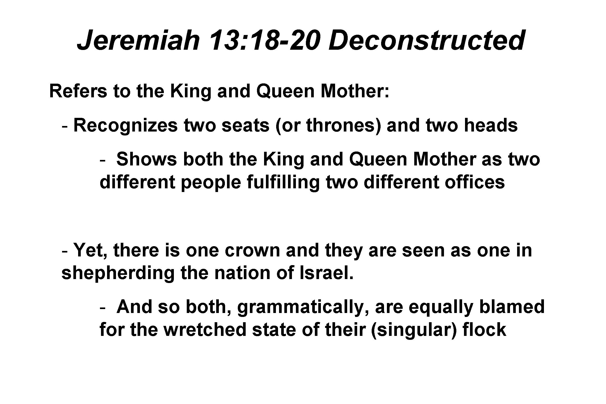 God’s words through Jeremiah show that the Queen Mother had authority in the kingdom while serving her son. For Jeremiah 13:18-20 used a singular “you” and “crown” when referring to both the King and the Queen Mother. So, although both held different offices and were two different people, the King and Queen Mother were viewed as one entity. And so they prospered and suffered as one. That’s why, grammatically, both the King and the Queen Mother are equally to blame for the poor condition of Israel.