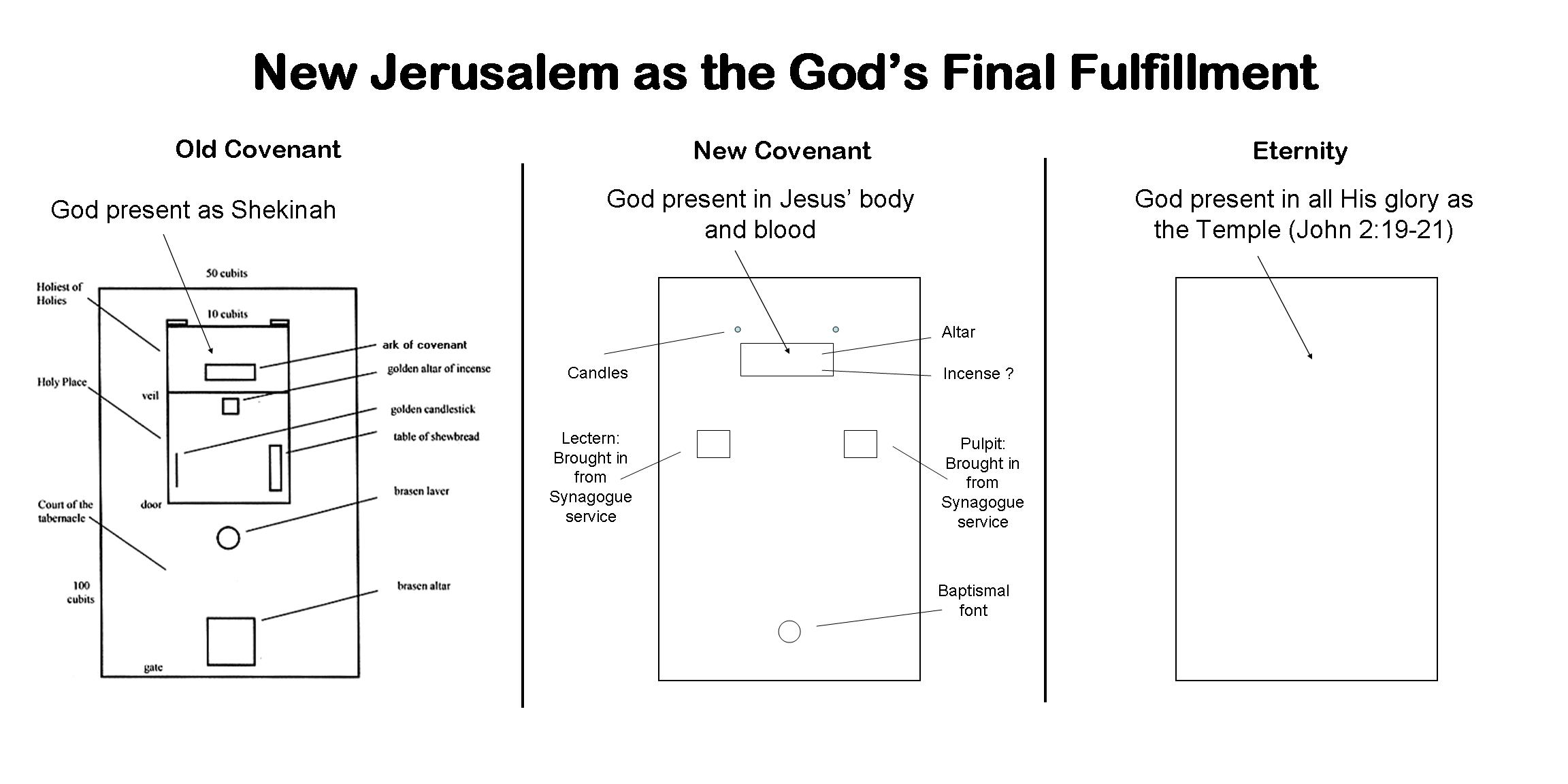 - Old Covenant worship prefigures New Covenant worship and eternity with God.