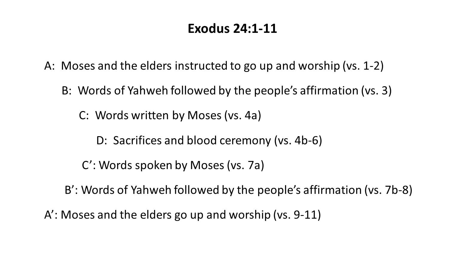 Exodus 24:1-11 uses a chiastic literary structure to highlight the covenant between God and His people. In a chiasm, the main point is also the center point of the chiasm. In this case, it’s the sacrifices and blood ceremony.