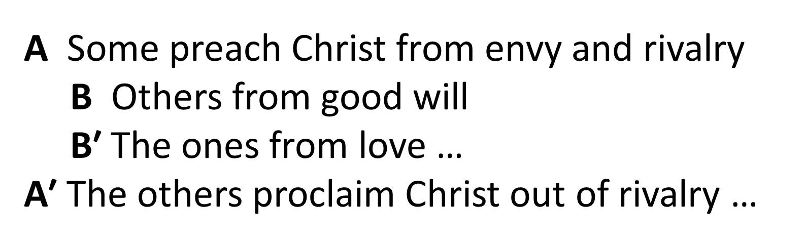To reinforce the point, Paul and Timothy used a small chiasm to emphasize what the proper motives should be for speaking the Gospel. The main point is the center of the chiasm, in this case B and B’.