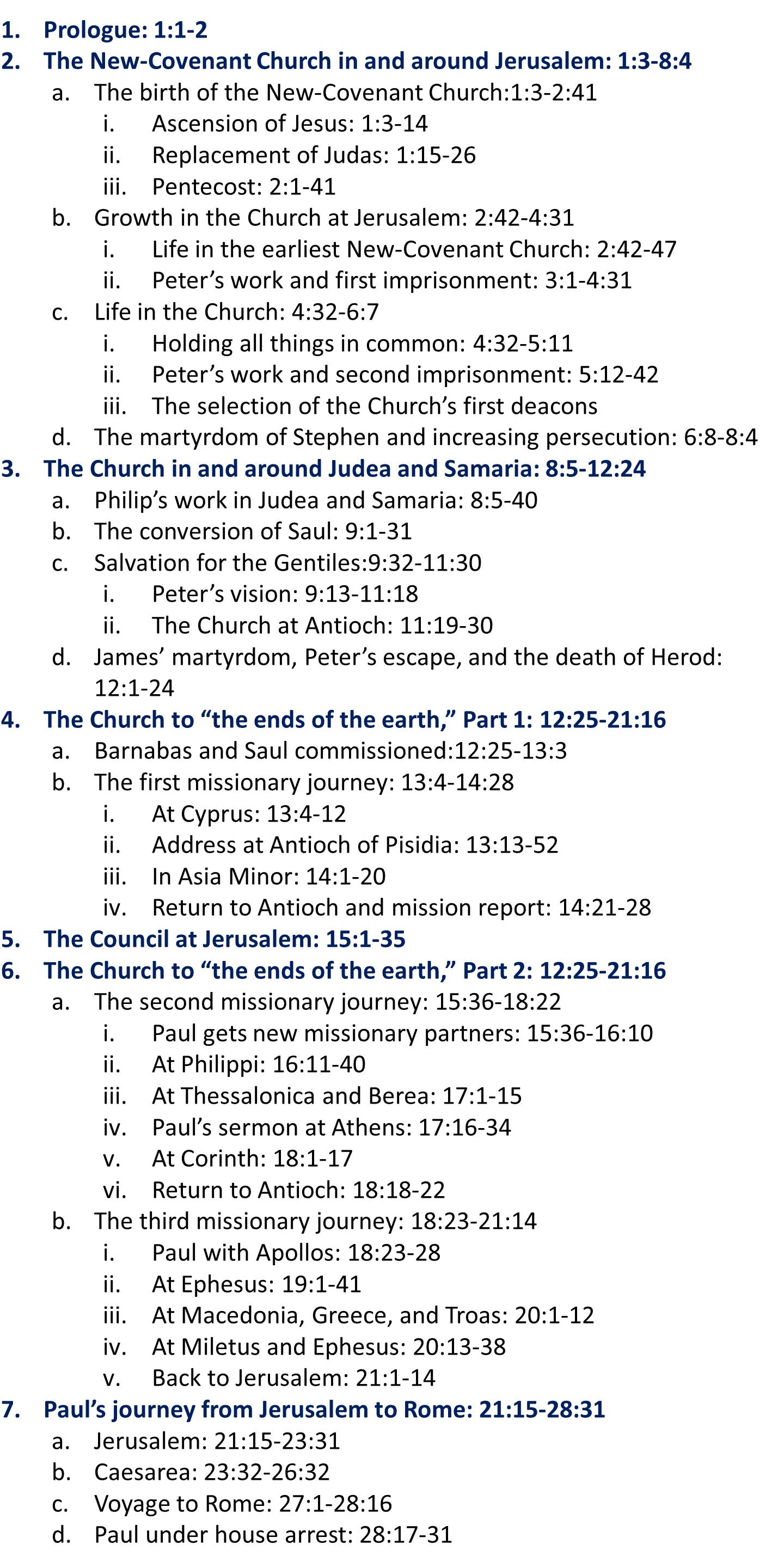 Themes: The spread of the gospel by the Apostles, in particular Peter (Acts 1-12) and Paul (Acts 13-28), from Jerusalem to the entire Roman world (Acts1:8). Acts recounts first Christian mission work and the work of the Holy Spirit, whom God the Father sent through His Son, empowering the Apostles and others to carry the good Word of salvation.