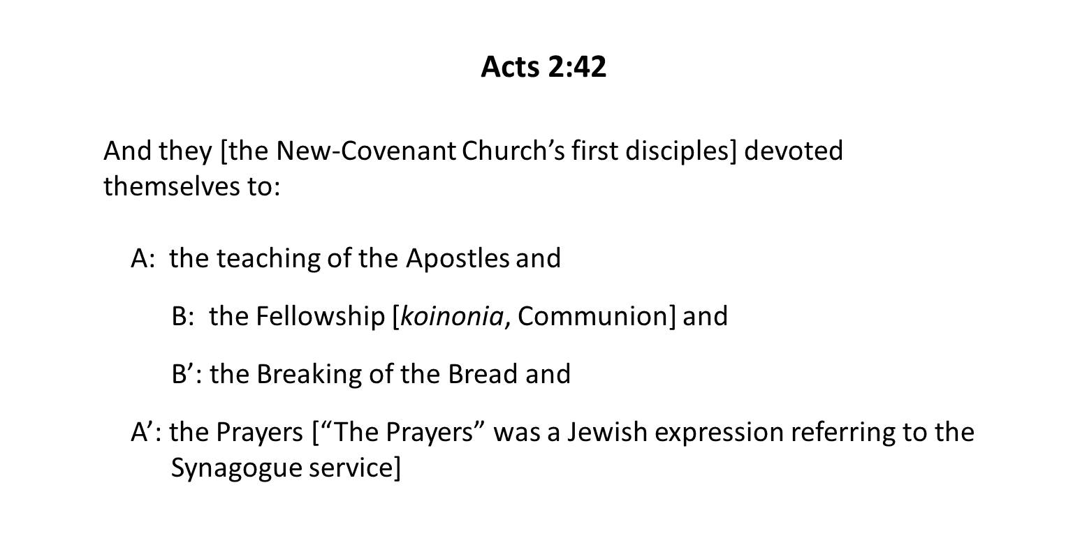 If Acts 2:42 is a chiasm, the first part (A and A’) is the “teaching of the Apostles” and “the Prayers.” Teaching would then refer to the exposition of Scripture, which was a hallmark of the synagogue service (which became incorporated into the early Church as the “Service of the Word”). “The Prayers” would also refer to the same part of the worship service.