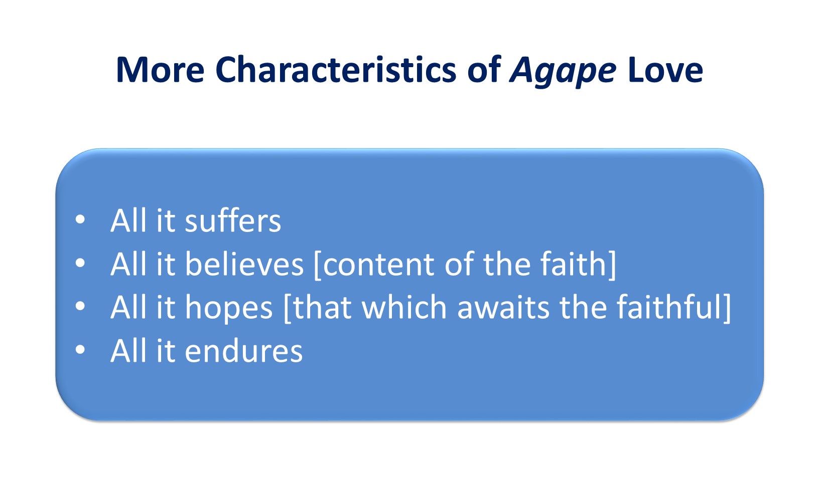 In finishing this section on the character of agape love, Paul again uses repetition. He lists a series of traits, all beginning with the Greek word for “all.”