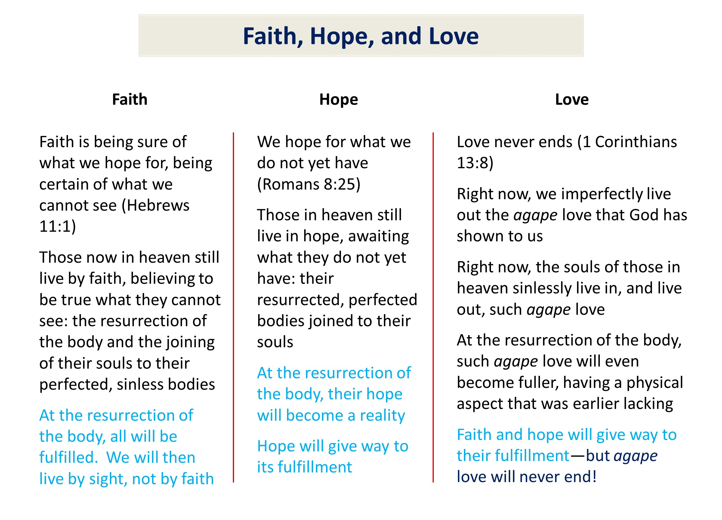 When Paul wrote that we will see “face to face,” he was pointing to the reality of eternal life after the resurrection of the body. Then, we will “not know in part,” for we will be all that God originally created us to be, confirmed in sinless perfection. Then we will “know fully” and all can fully know us because we will then be fully complete.
