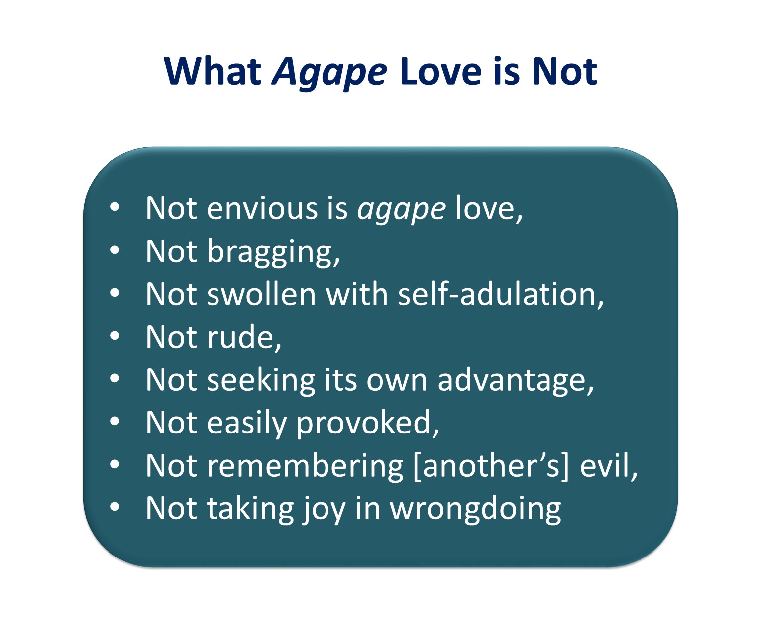 After showing how agape love expresses itself, Paul now lists what love is not. He does this through a series of 8 statements, all beginning with the Greek word for “no.”