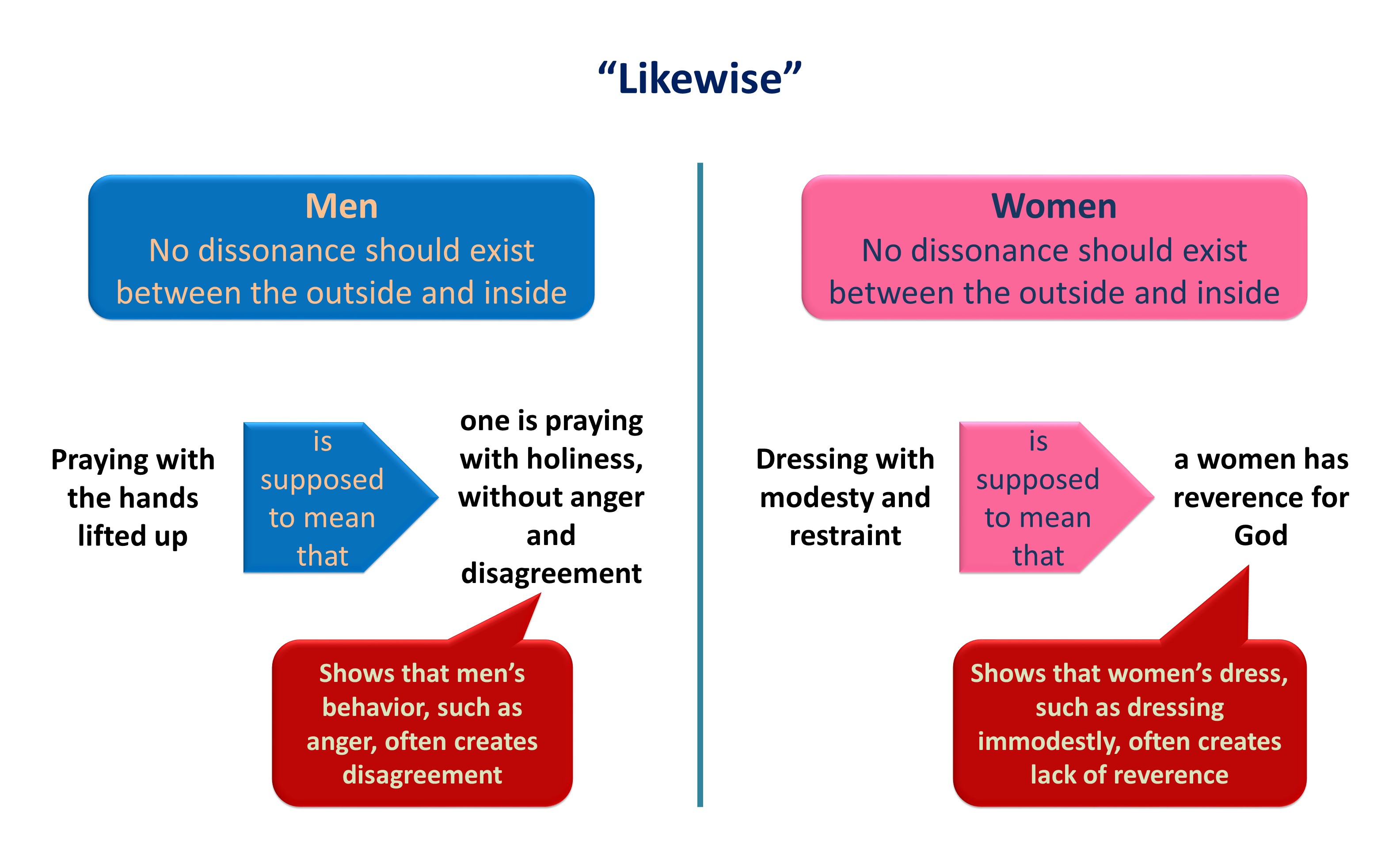 - Paul contrasts men leading worship (prayer) with women not leading worship (learning quietly).