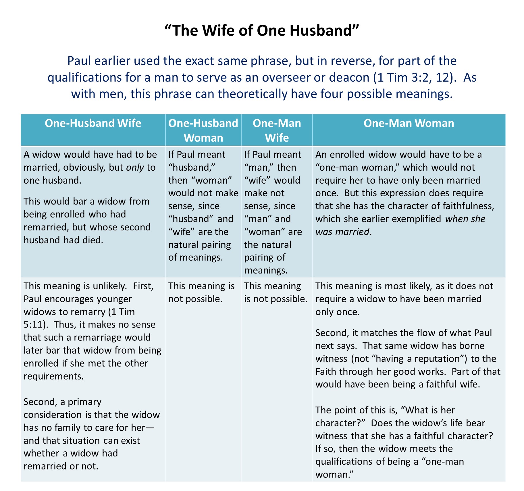 Read 1 Timothy 5:9-10: A widow be enrolled [C, but passive]… having been [A, participle] a one-man woman…
