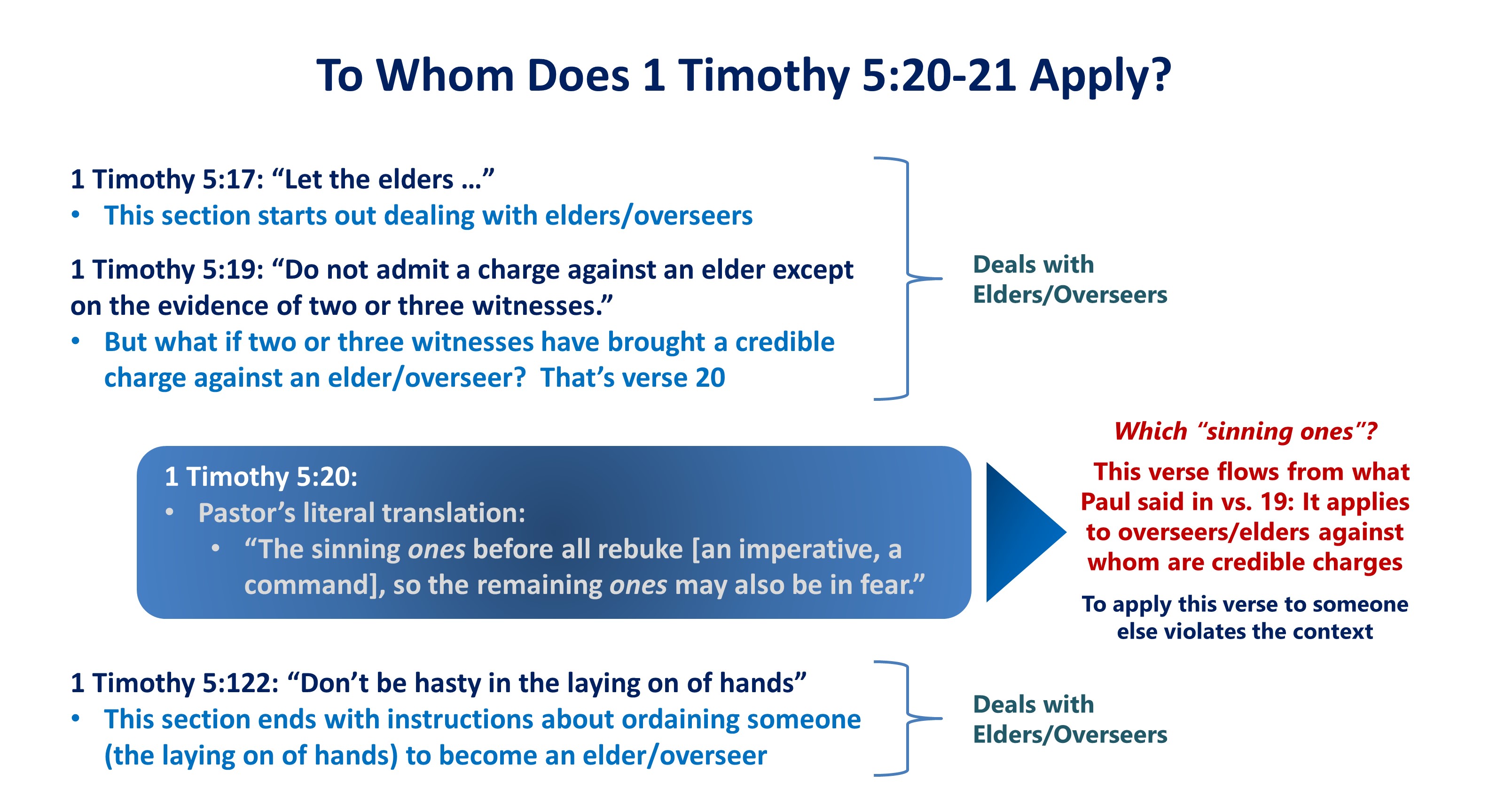 - Discuss: Paul tells Timothy how to handle these sinning elders/overseers, not congregations (in his other epistles). What are the implications of this?