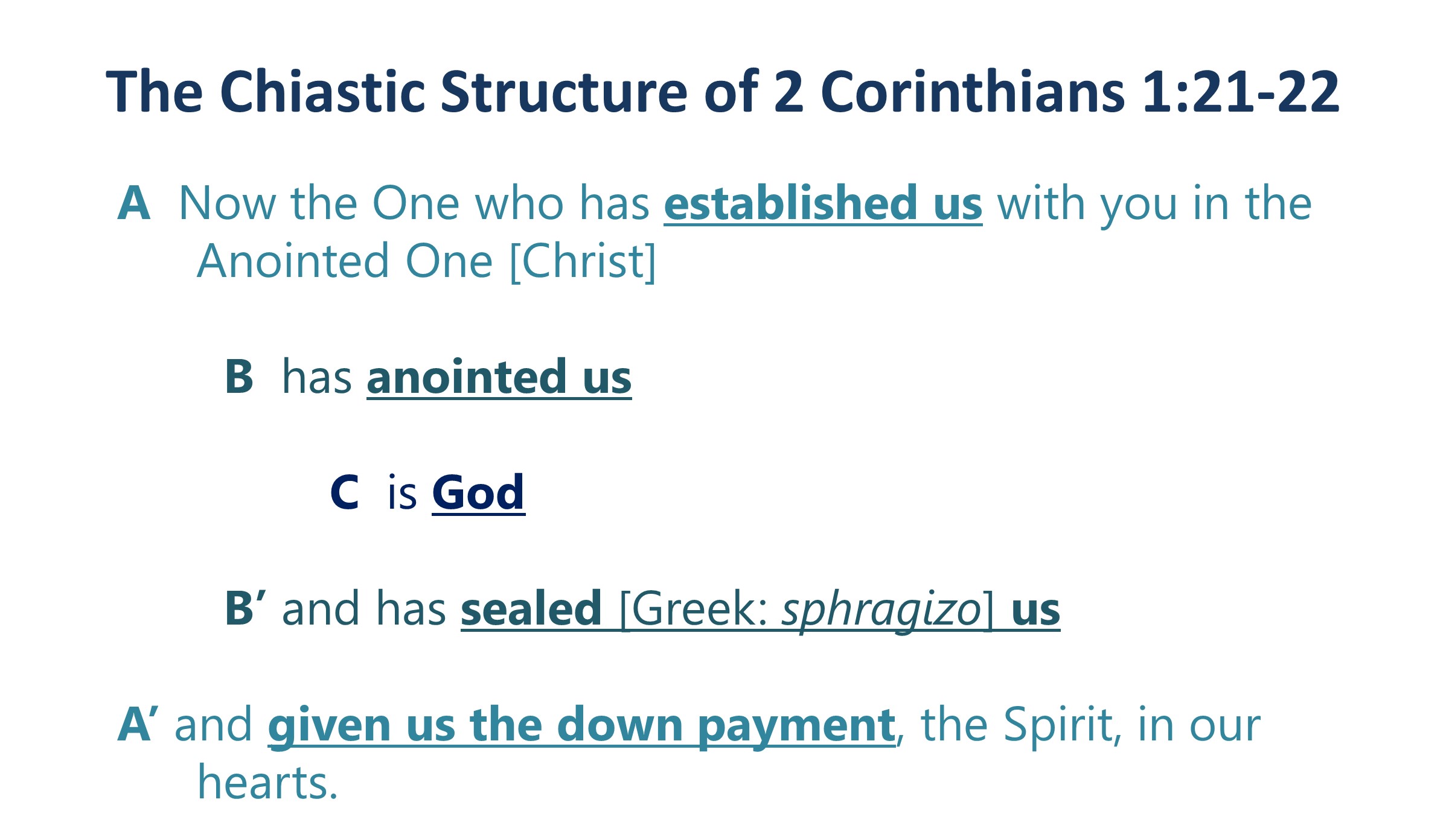 2 Corinthians 1:21-22 is a chiasm in the original Greek text. A chiasm is a literary device where the text makes two or more points and then re-mentions those points in reverse order, often using different words or expressions. In a simple chiasm, you will find an A B A’ or A B B’ A’ pattern. Further, the central point is in the center of the chiasm.