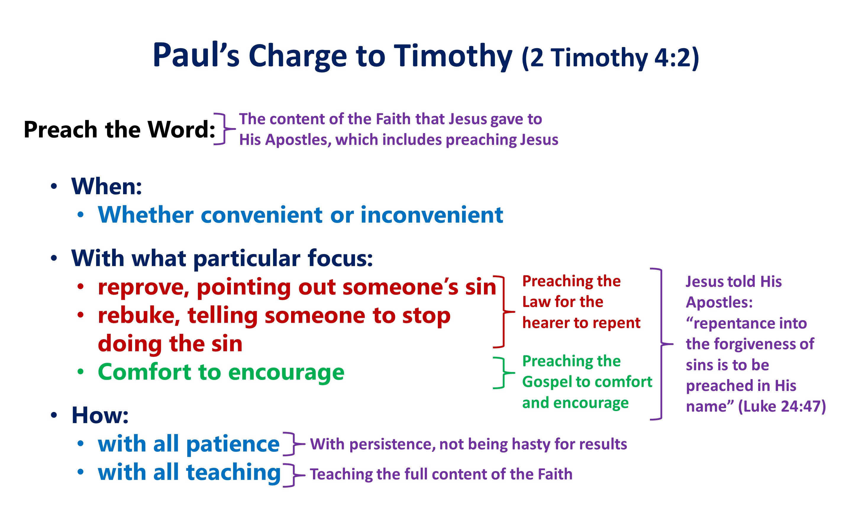 “Preach the Word”: Preach is an imperative verb, a command. Earlier, Paul used “the Word” (ton logon) in 2 Timothy 2:9, referring to Jesus whom he preached, who was not bound. In 2 Timothy 2:15, Paul told Timothy that he was to speak “the Word” with exactness and precision, without flaw or error. “The Word” here refers to delivering the content that Jesus gave to His Apostles, which includes preaching Jesus.