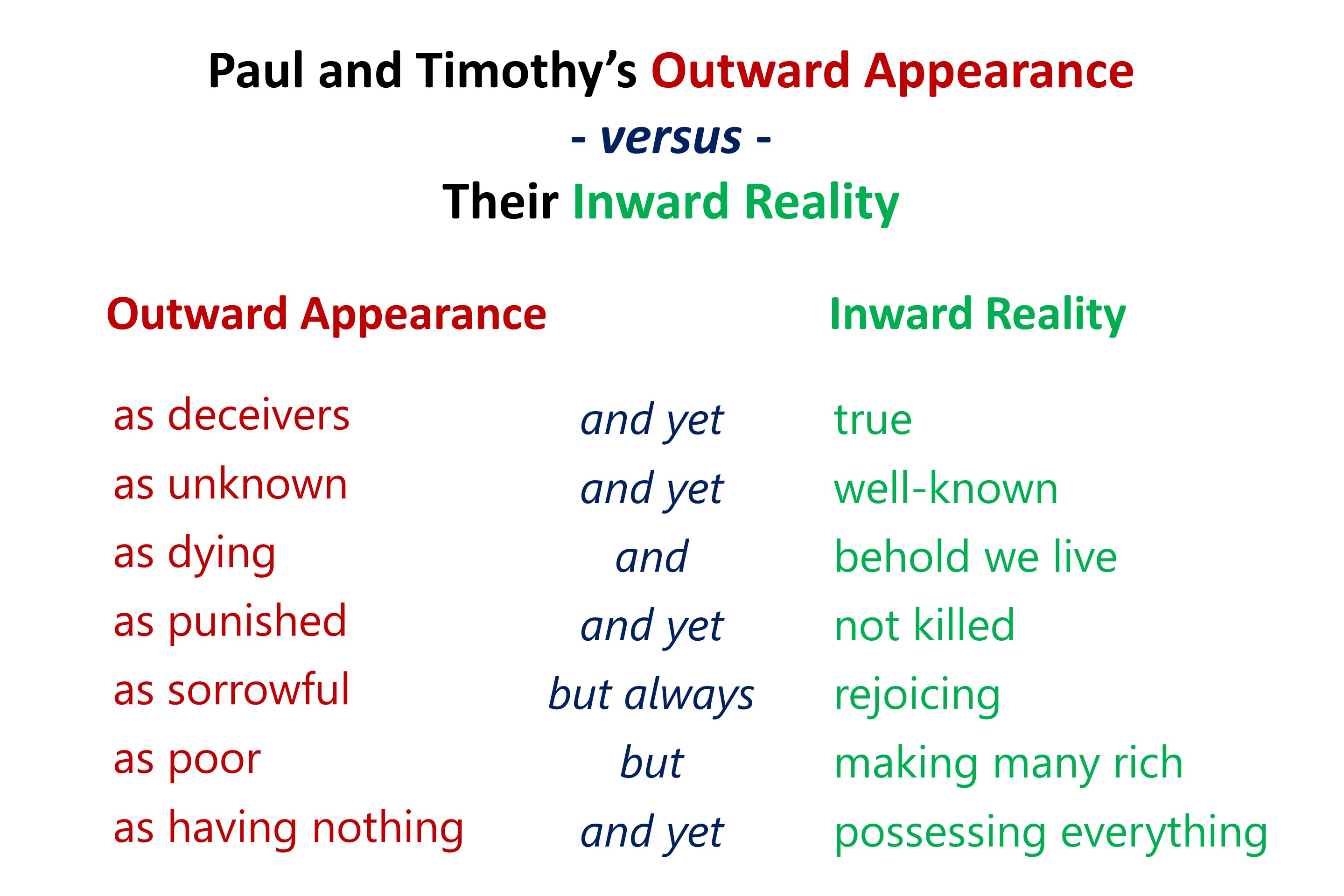 Paul and Timothy now tackle seven accusations leveled against them at Corinth. After each accusation, they list a contrasting fact. Those outsiders at Corinth, with letters of recommendation, only see their outward afflictions, but know nothing of the spiritual motives and joys hidden behind their suffering.