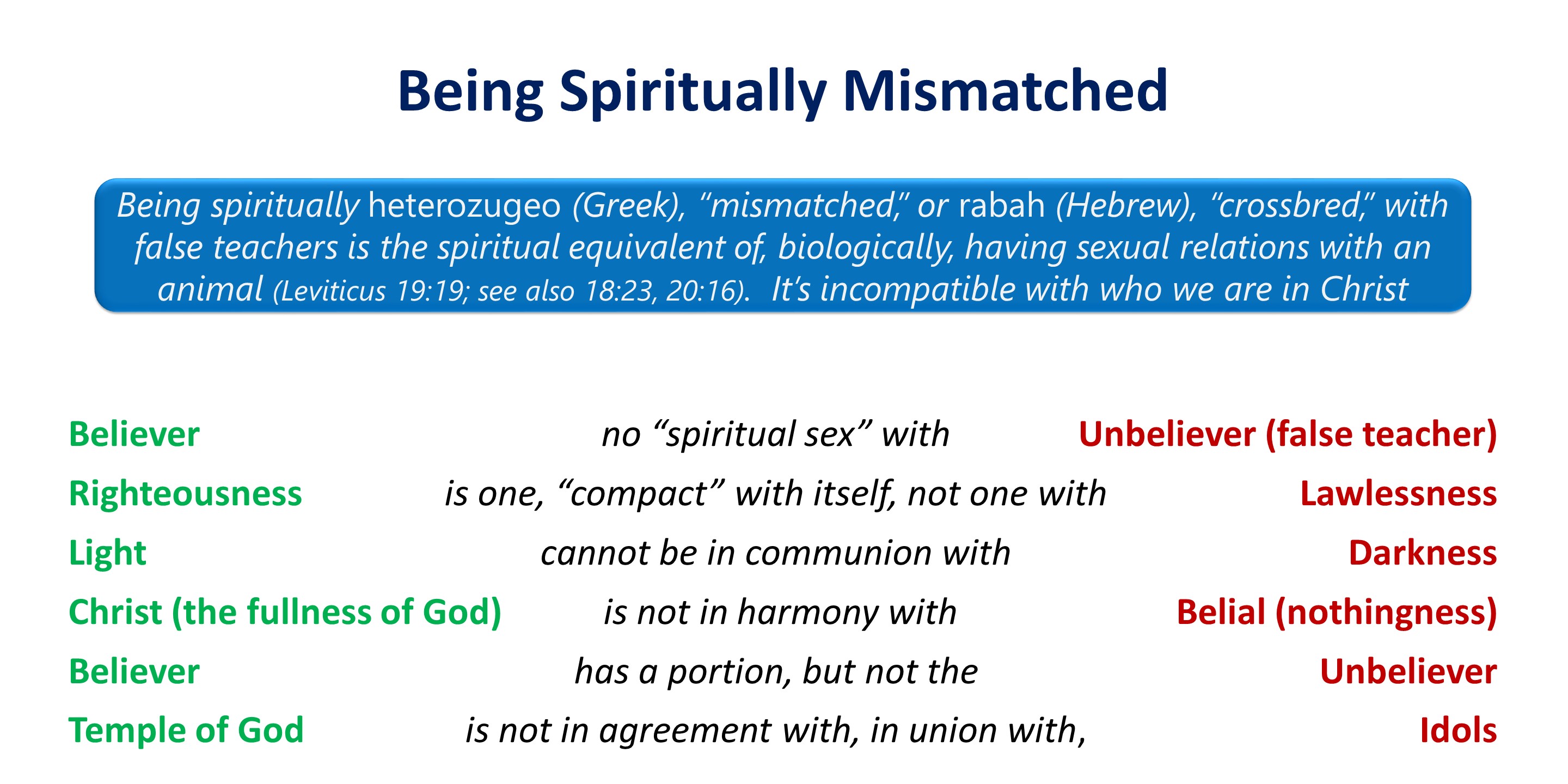 The imagery of trying to mate with another species equates to being one with these false teachers and worshiping with them. We’ll see this in the other contrasts that Paul and Timothy make.