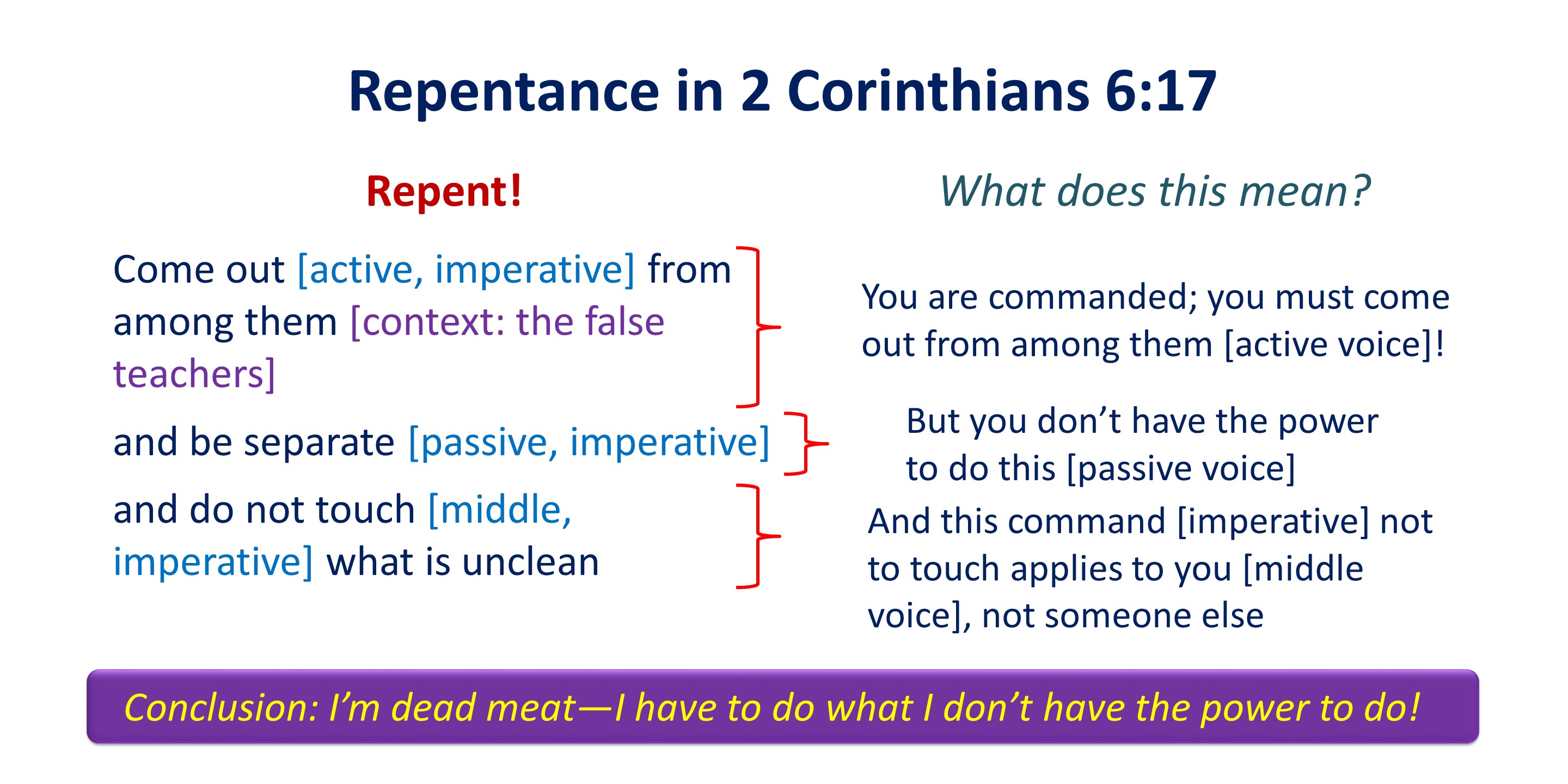 But here’s the quagmire: The false teachers don’t come with the fullness of Christ; they come with the emptiness of Belial, even while claiming to be brothers. Thus, the Corinthians were to be where Christ and His Word came to them, not Belial with his emptiness.