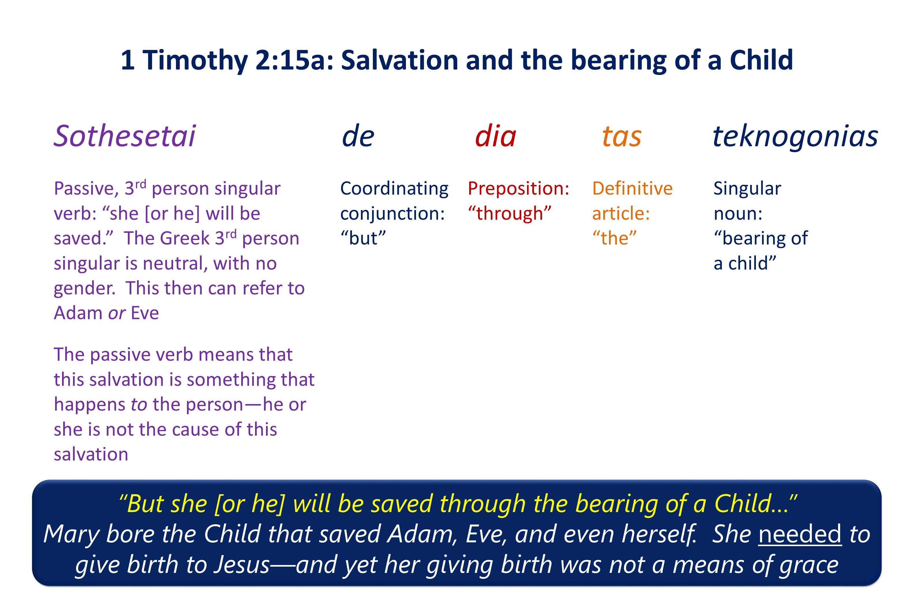 1 Timothy 2:15:“Yet, she will be saved through childbearing” (ESV). The ESV makes it seem like that Eve will be saved “through childbearing.” But Paul was pointing to another birth.