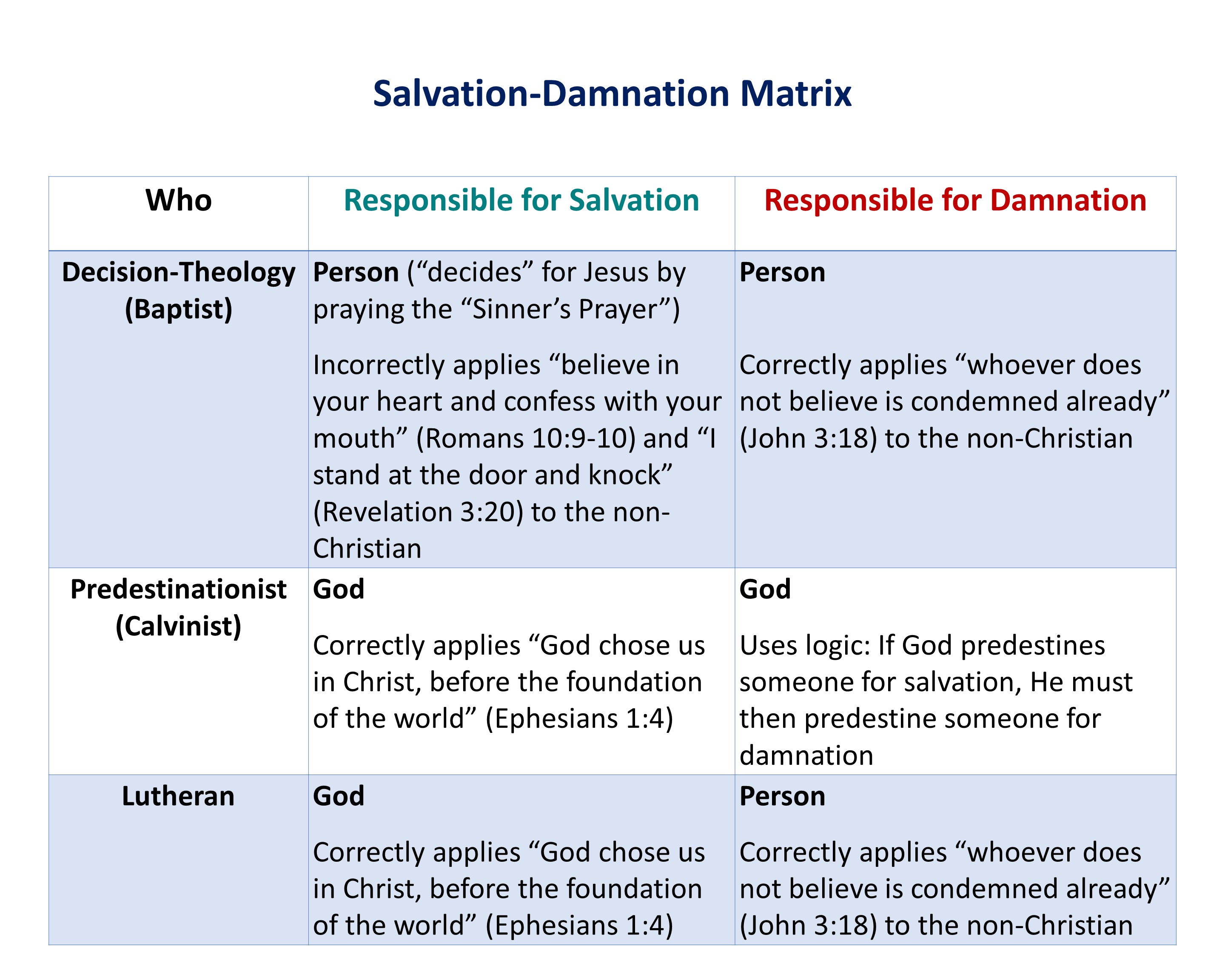 Salvation and damnation do not make logical sense. When we try to reconcile the illogicality of why someone is “saved” or “not saved,” we believe incorrectly, which leads to incorrect practices. Even salvation and damnation requires “walking by faith, not by sight” (2 Corinthians 5:7).