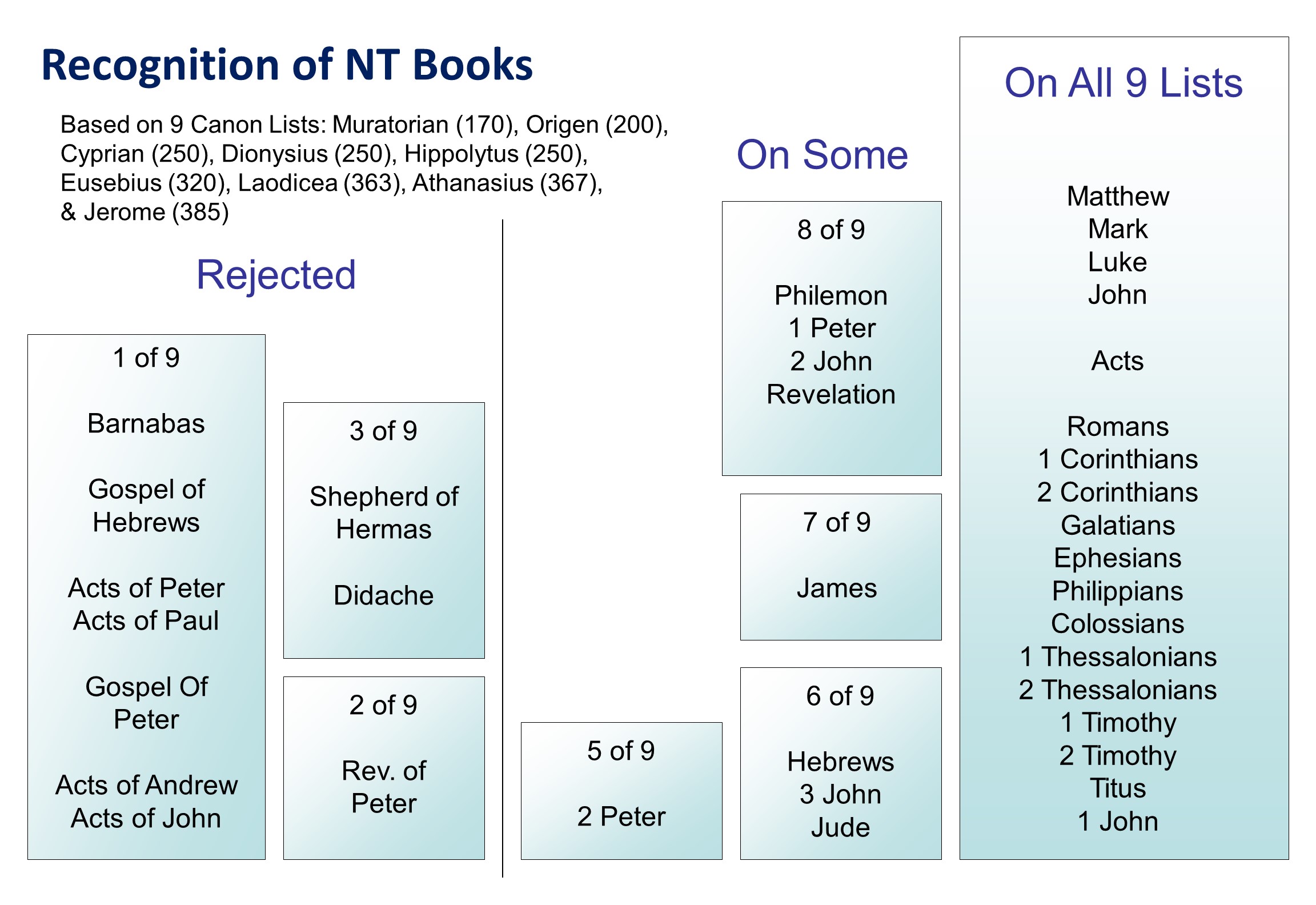 Looking at the various New-Testament book lists that existed before the Council of Carthage, this is what we find. Nine lists floated around cataloging the different books of the New Testament. The boxes below show how many of those lists considered a book as New-Testament Scripture. The “Rejected” columns are those books that didn’t “make the final cut” to become part of the New Testament. The “On Some” or “On 9 Lists” show the books that did “make the cut.”