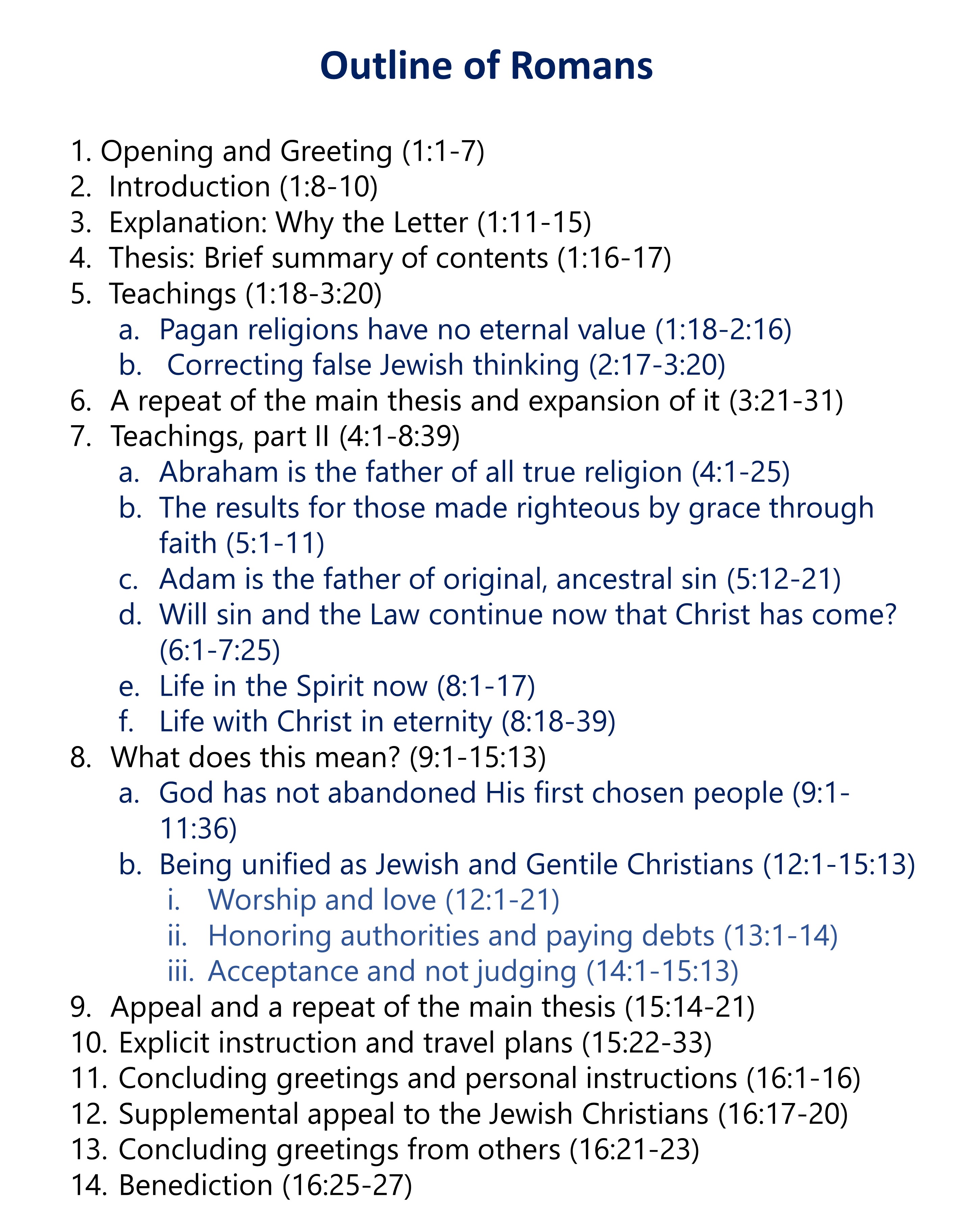 Biblical scholars have not reached any consensus in identifying a specific rhetorical style or literary format that Paul used for Romans. So, to provide an outline to help us see a structure within Romans, your pastor has approached Romans, first, as a letter to resolve the disunity between the Jewish and Gentile Christians. From such a viewpoint, here is the outline.