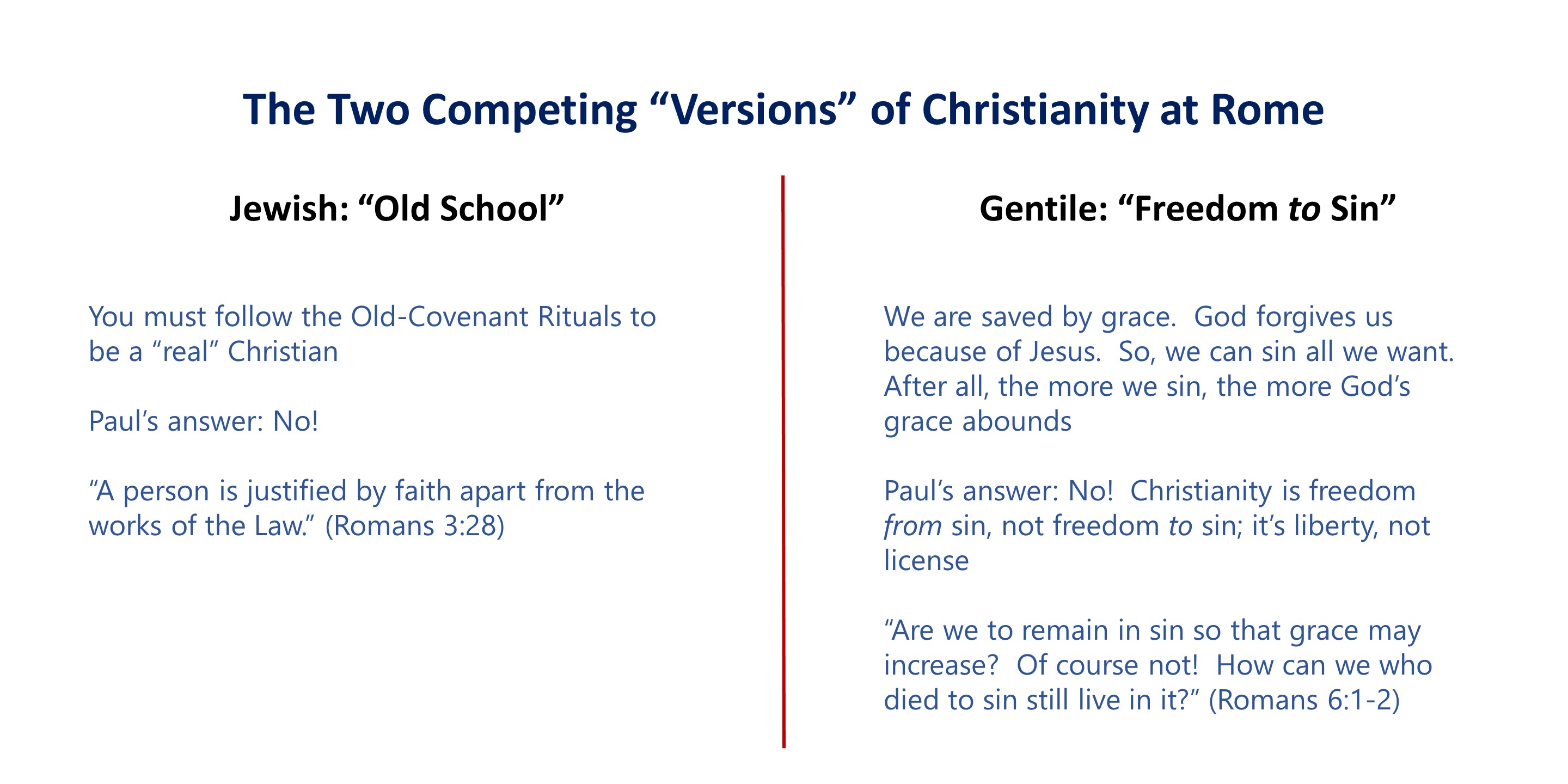 We see Paul dealing with these “versions” of Christianity even in his use of the Old Testament (then the Scriptures). When dealing with the Jewish “problem,” we find many allusions, quotes, and echoes of the Old Testament: Romans 1-4:25 and chapters 9-11. With the Gentile “problem,” we find almost no direct references, for example, Romans 5:1-8:39, even though he did use the Old Testament in this section with broad brush strokes.