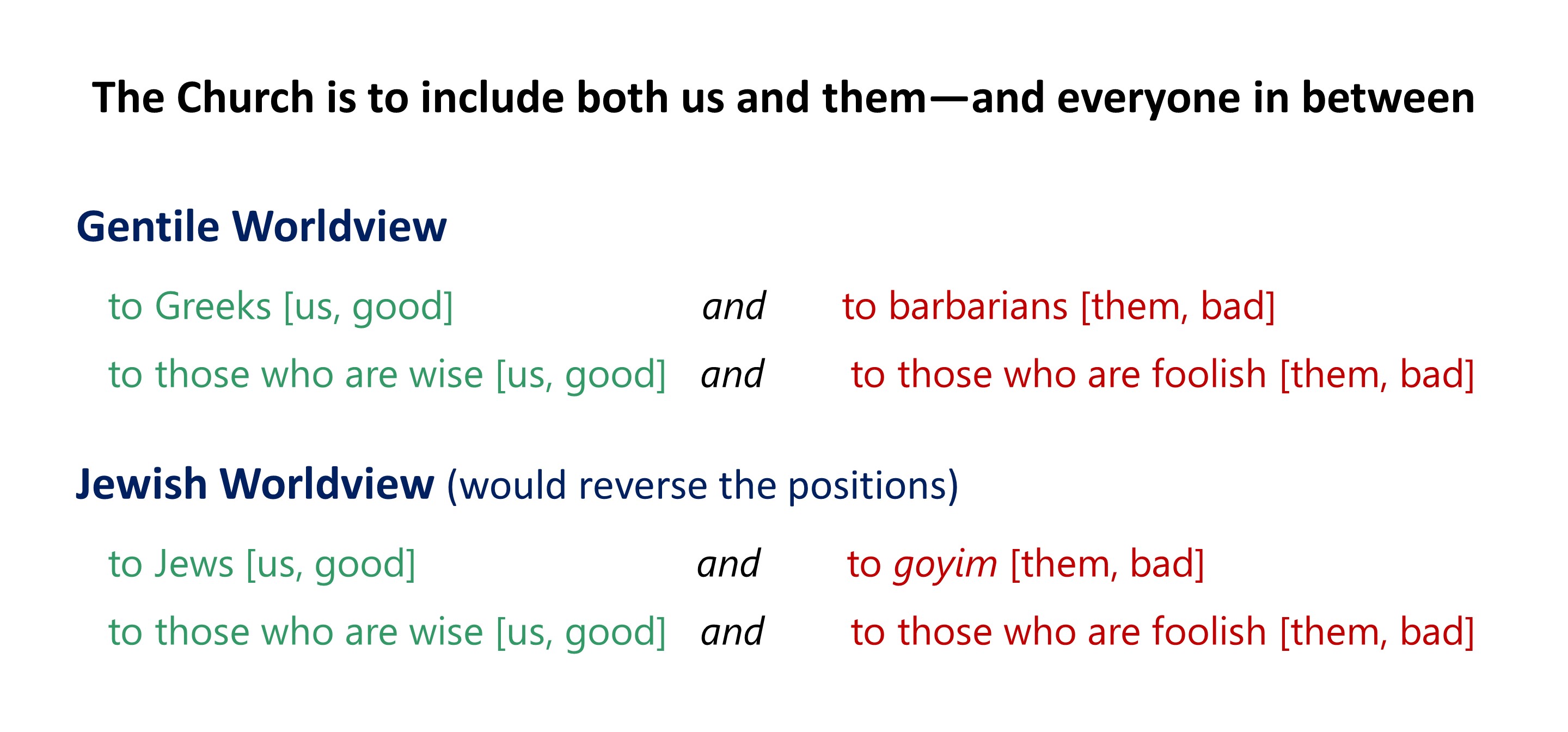 Paul undercuts both Jewish and Gentile (Greek) worldviews. He does so by using the connotations that existed in both Greek and Hebrew. Now, the Jewish Christians then were no longer fluent in Hebrew, but their prejudicial ideas from Hebrew still existed. (Even so today! The Jewish word “goy/goyim,” foreigner, has a negative connotation attached to it: “them” not us.)