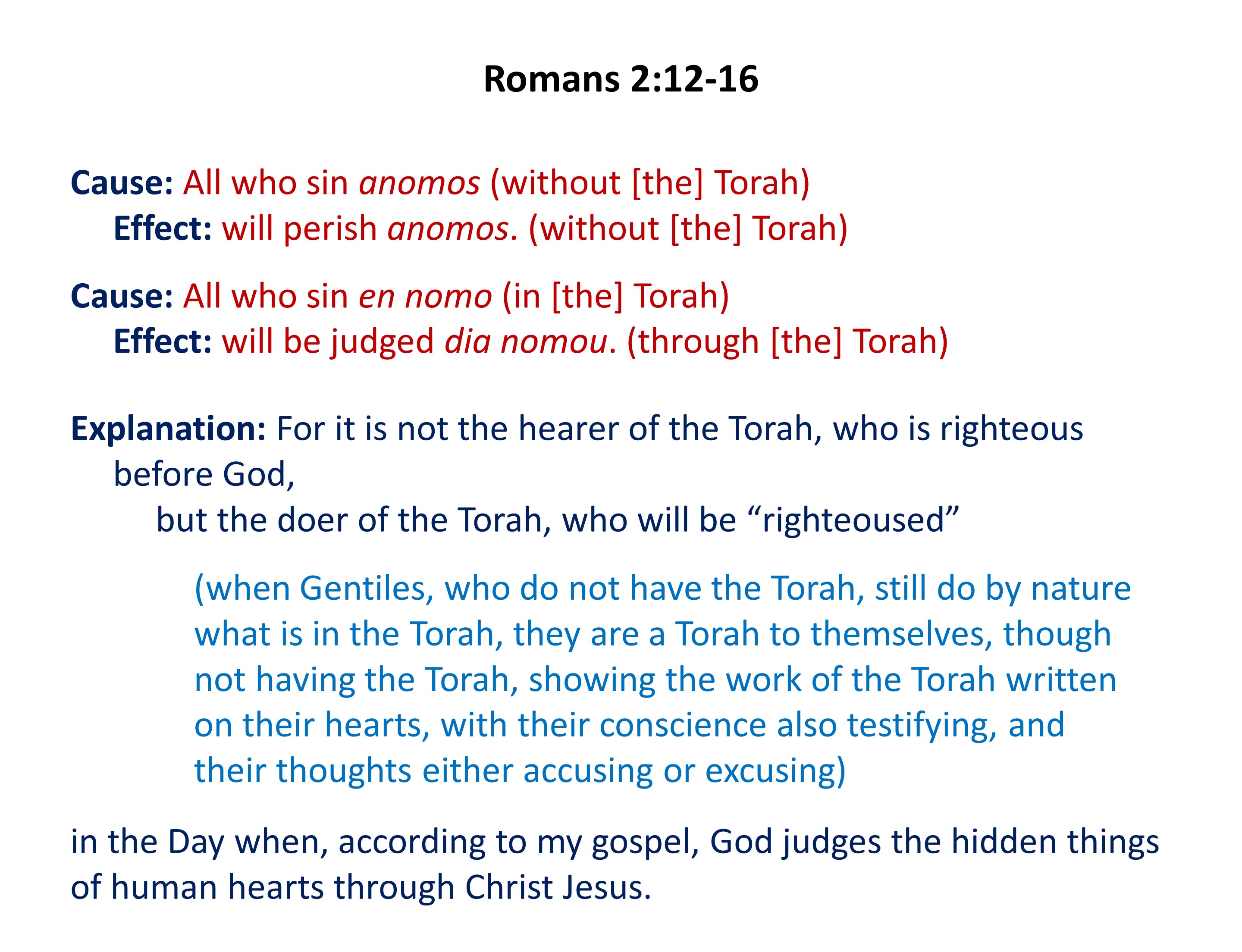 “by nature… either accusing or excusing”: This remnant of the Torah still in our hearts (“by nature”) is, however, corrupted. That’s why we have non-Christians who can behave well and others who become serial killers. Because of this remnant of the Torah, God’s instruction, even Gentiles will be judged. The irony of this remnant is that is still accuses us when we sin, even while letting us rationalize away our sin.
