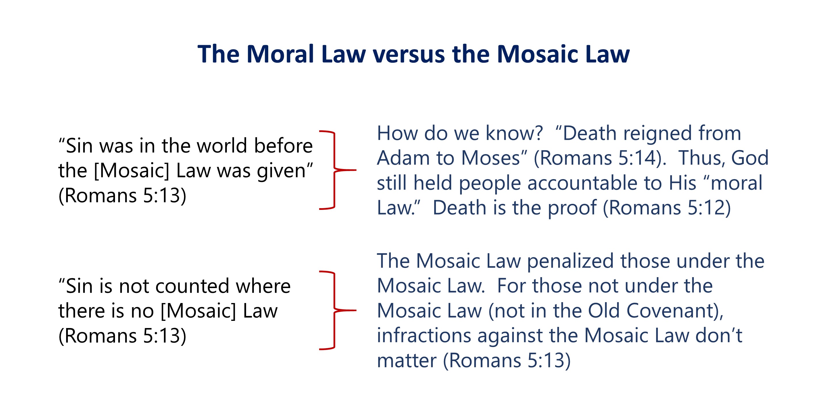 Earlier Paul stated: “Where there is no Law, there is no transgression” [“stepping over” the line] (Romans 4:15). Now he deals with this possible question, “How can Adam be guilty of sin when God had not yet given His Mosaic Law?” Instead of answering, however, Paul points to the result of sin (death) from the time of Adam to Moses to point to the Law’s Fulfiller.