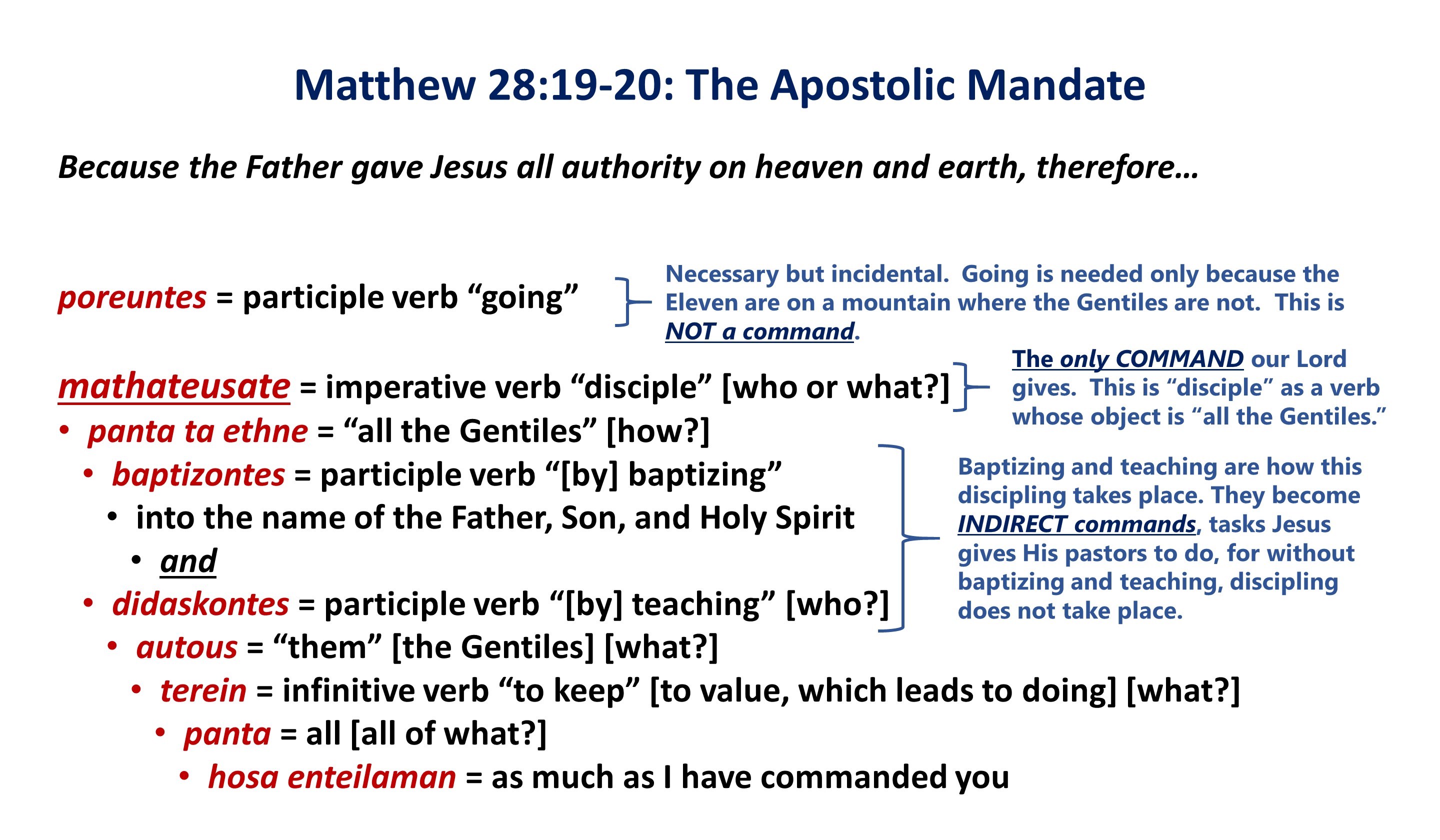Jesus commands the Church’ first pastors, His Apostles, to “disciple” by baptizing and teaching.