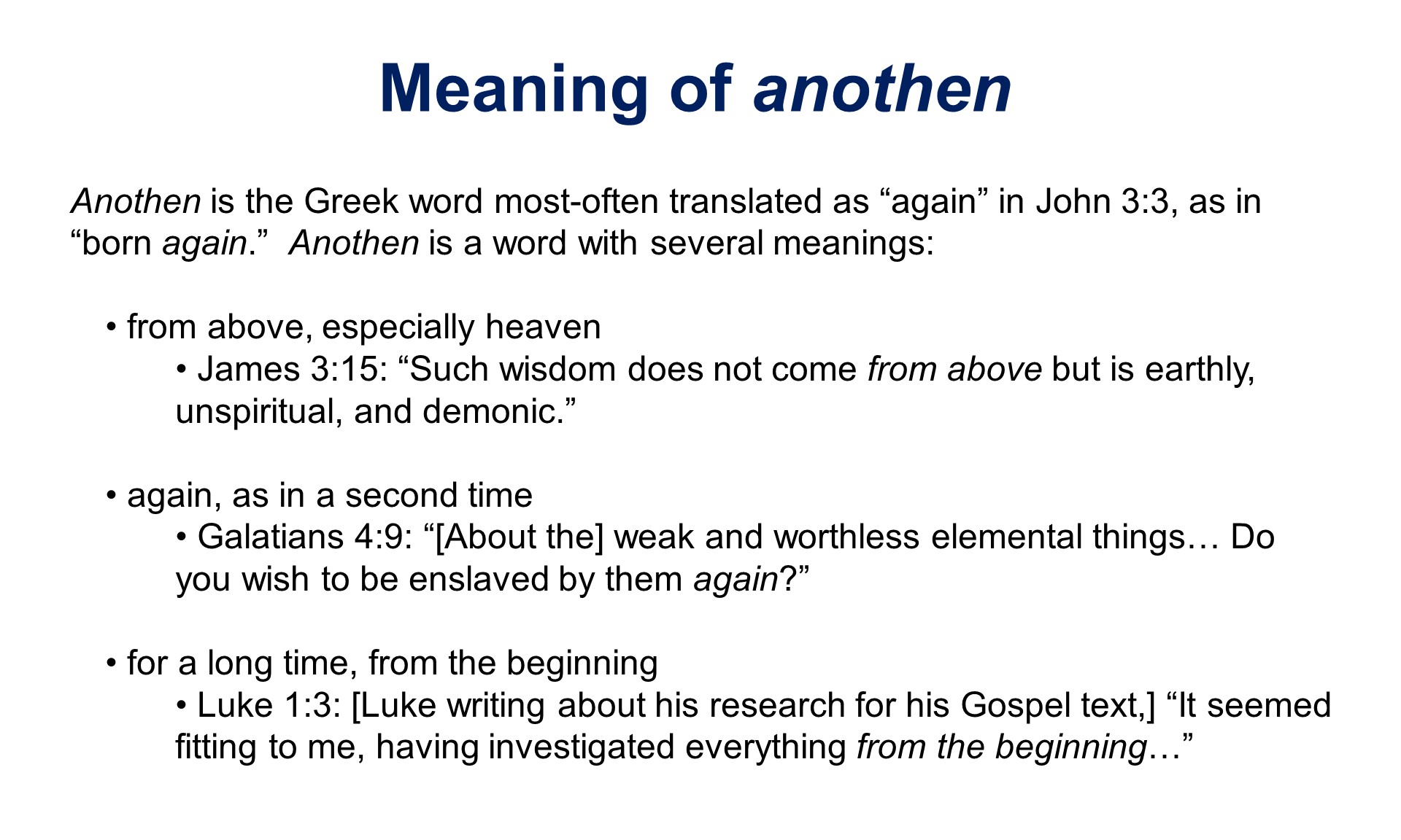 - How do we know Nicodemus is thinking of being born a second time, but Jesus means being born from above? (vs.3, 6-7)