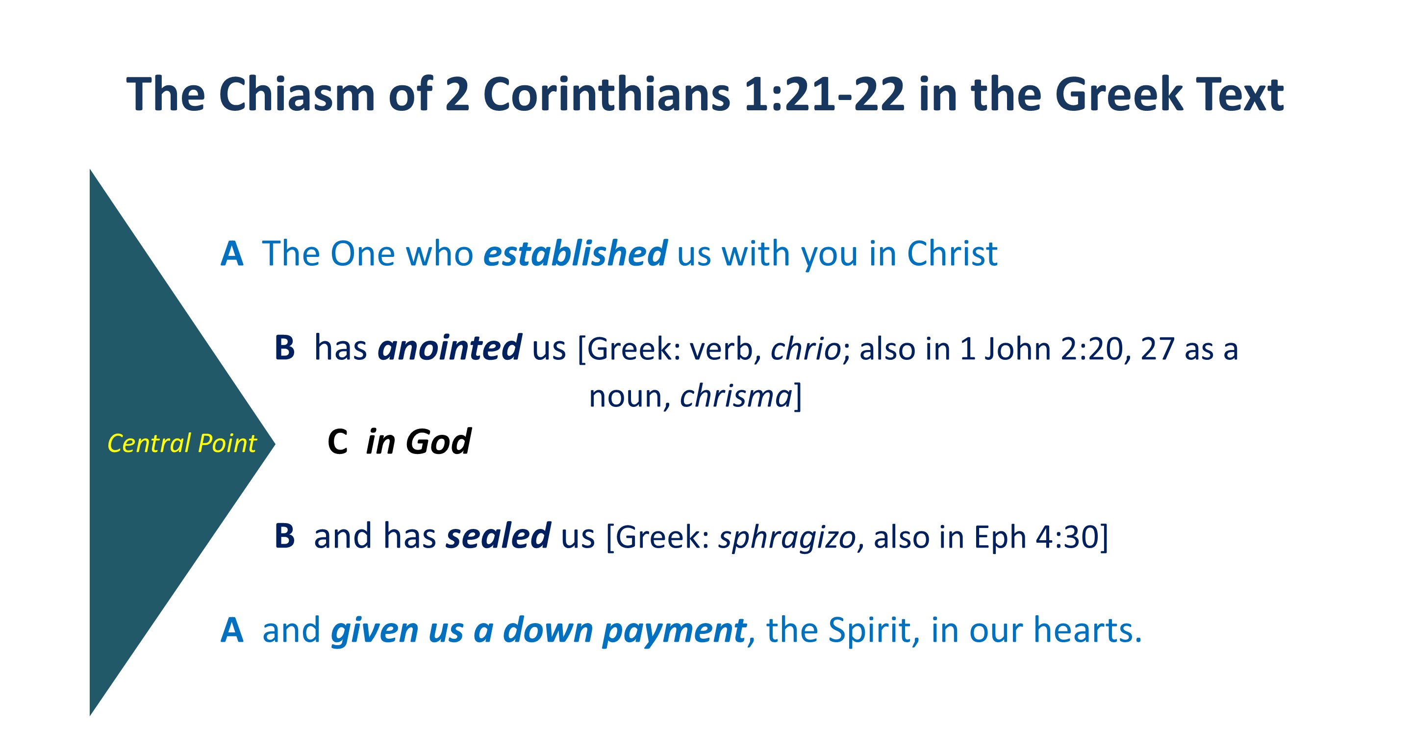 When we look at 2 Corinthians 1:21-22, we find Paul using a “chiasm.” A chiasm is a rhetorical device where the author makes two or more points and then re-mentions those points in reverse order, using different words or expressions. In a chiasm, the central point is in the center.