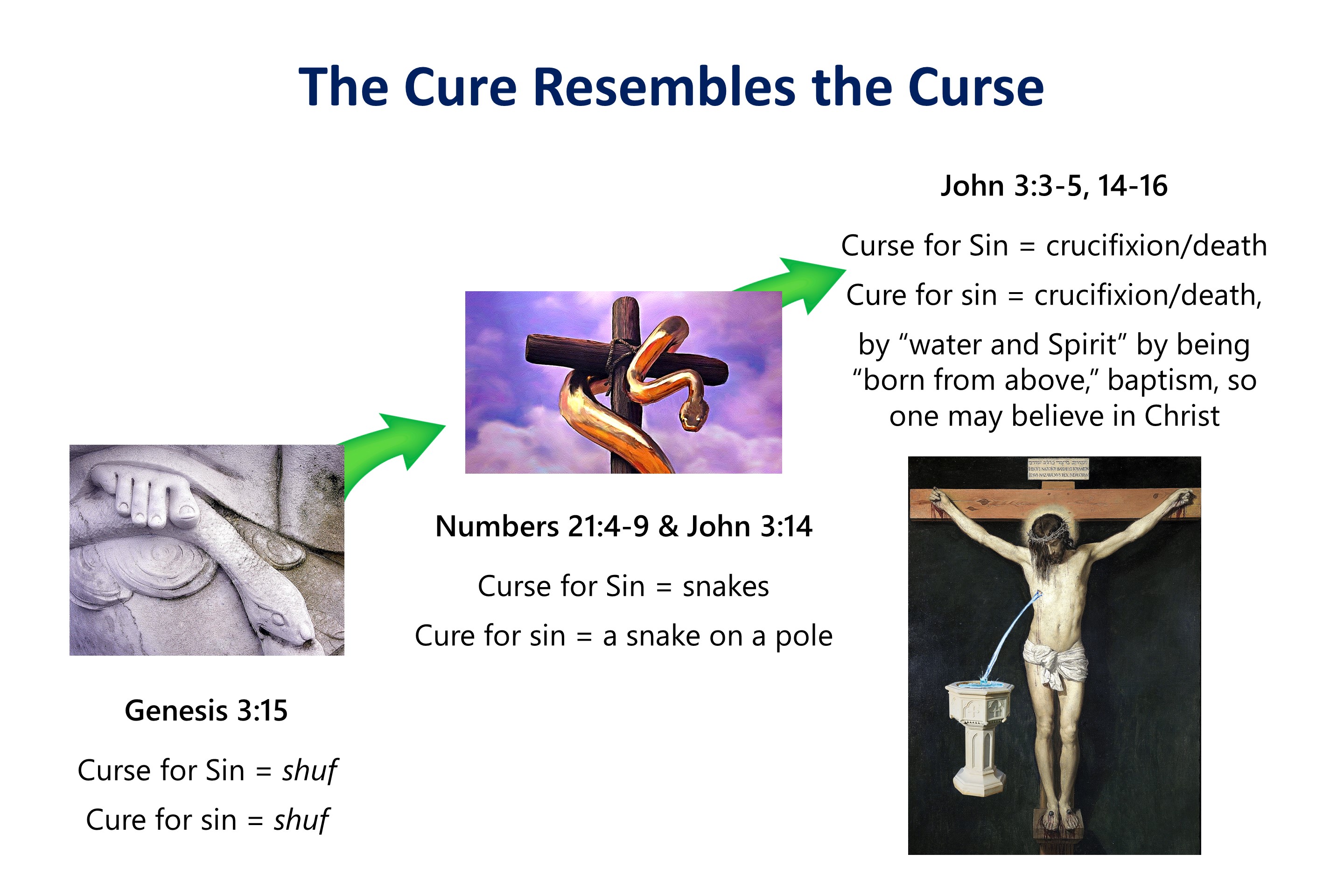 The Hebrew text emphasizes this point by using two homonyms in a wordplay, which sound alike. The first is shuf, in the form y’shufkah, which means to trample or crush. The second shuf is t’shufenu, the “ts” sound being that of a hissing snake before it strikes. By using the same root words and sounds, God lets us realize the cure for sin will resemble the curse.