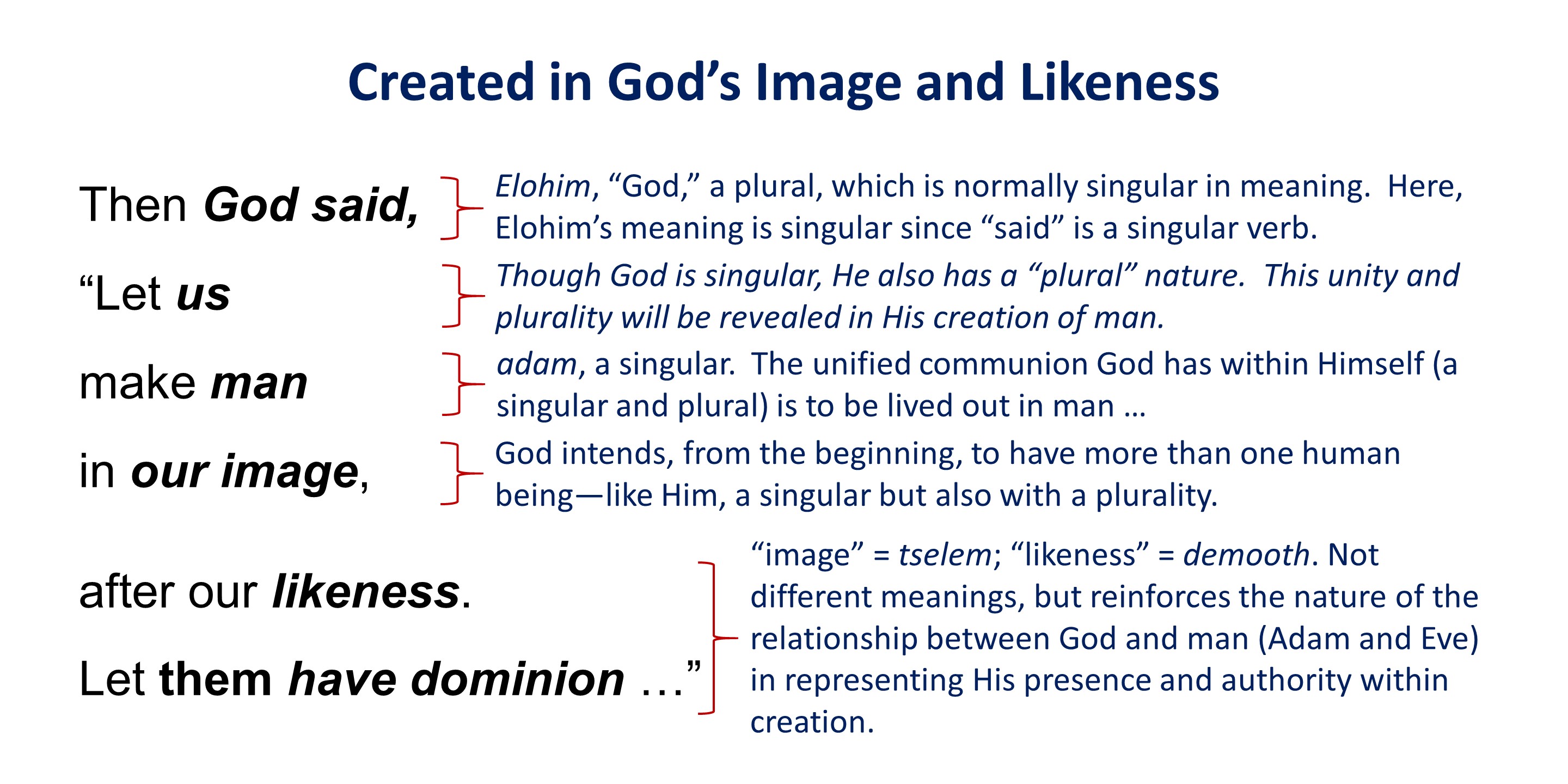 Genesis 1 speaks of man being created in the “image [tselem] and likeness [demooth] of God.”  Genesis 2 expands this to include the communion of persons: Adam and Eve.  The “image and likeness of God” include not only being human and created that way but comes into its fullness in the communion Adam and Eve share with each other.