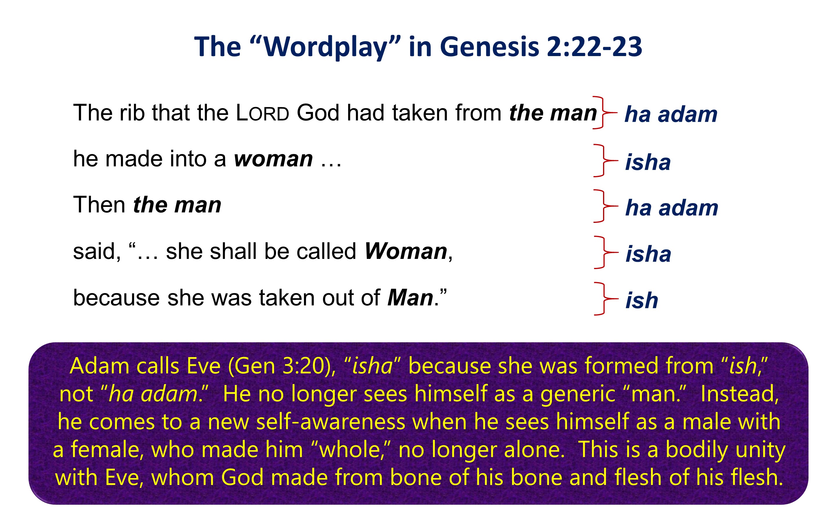 More than ezer neged, the change in Hebrew vocabulary reveals what takes place in Adam after the specifics of Eve’s creation take place.