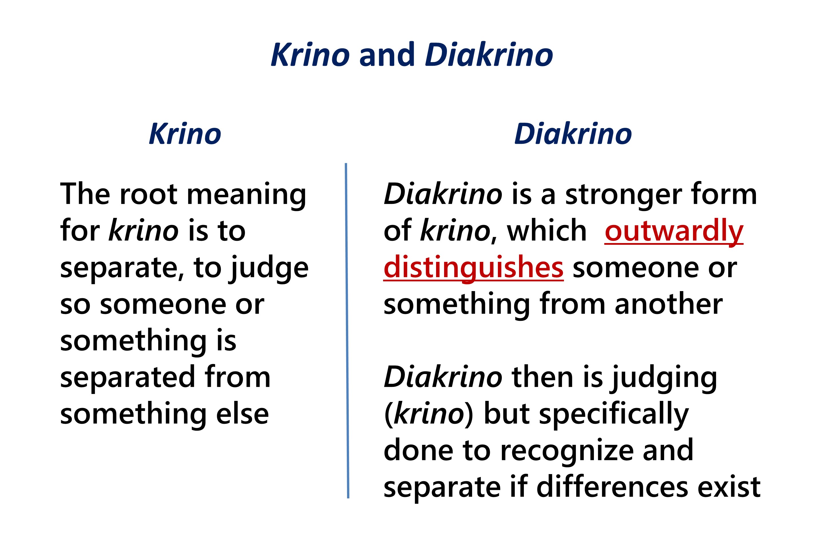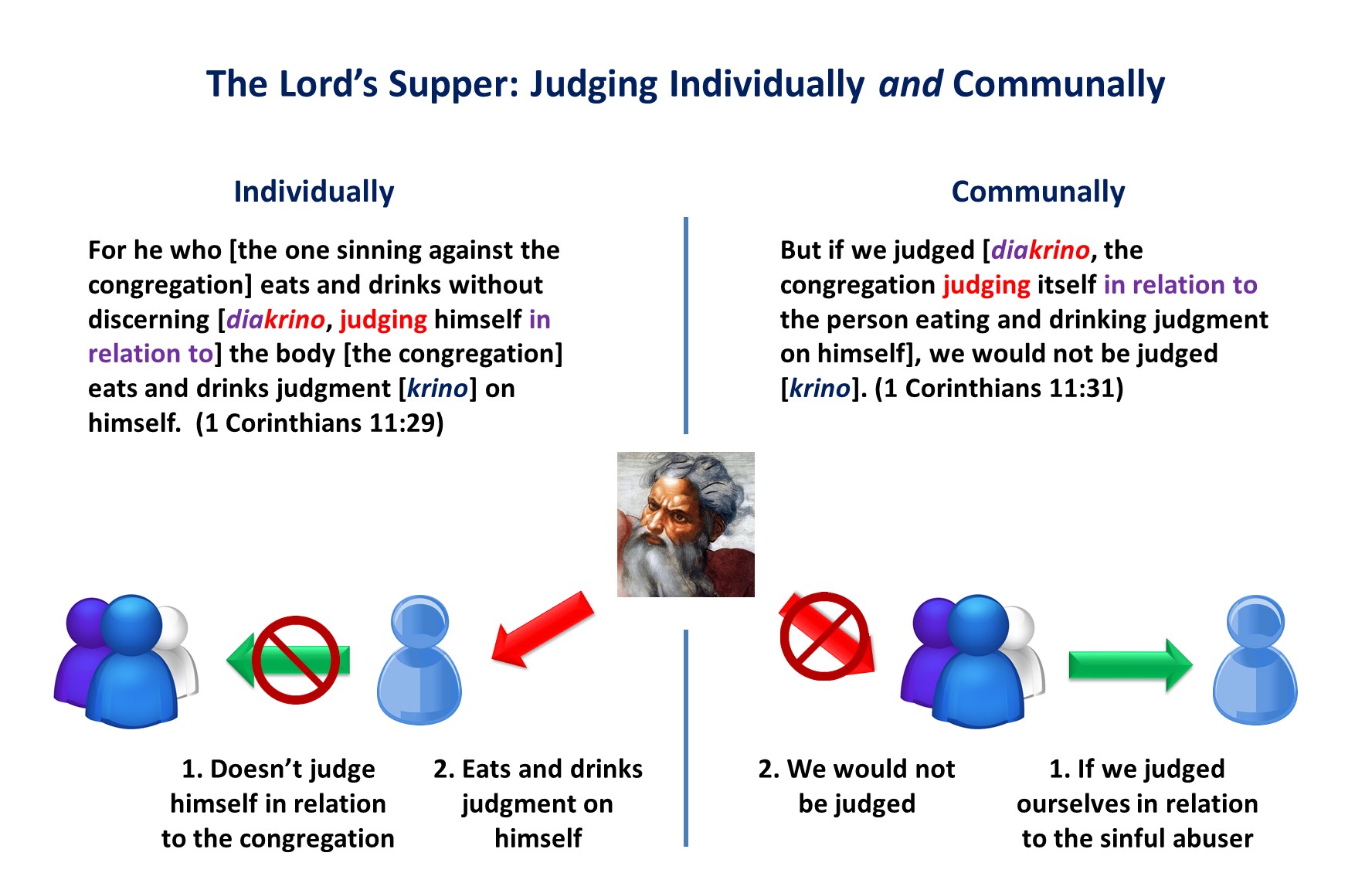 Let a person examine himself, then, and so eat of the bread and drink of the cup. For anyone who eats and drinks without discerning [diakrino] the body eats and drinks judgment on himself. That is why many of you are [spiritually] weak and ill, and some have died. But if we judged [diakrino] ourselves truly, we would not be judged [krino].
