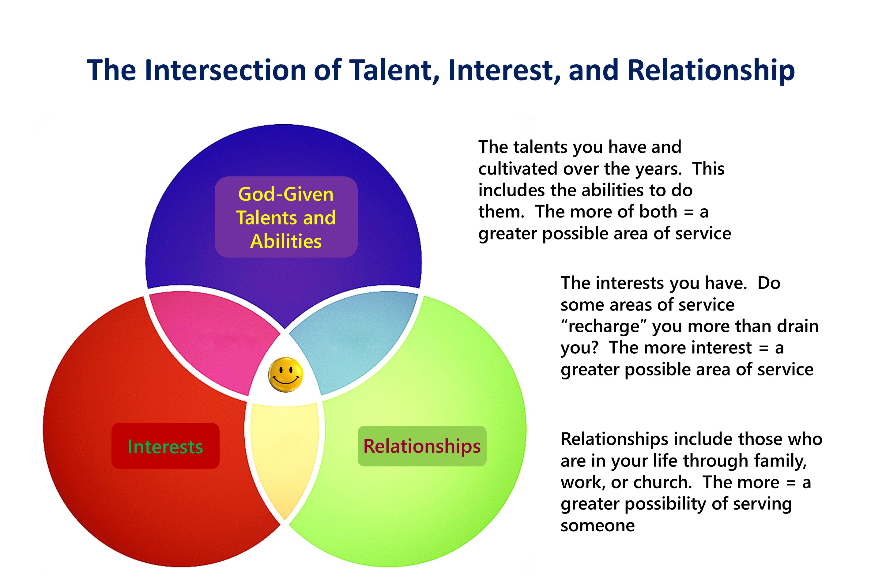 But how do you know how you should serve? Finding your vocation has to do, in part, with finding your God-given talents (what you can do) and your God-given personality (what fits the person you are), and whom God brings into your life. The matrix of these three areas intersects to enable you to understand and decide how and when you should serve.