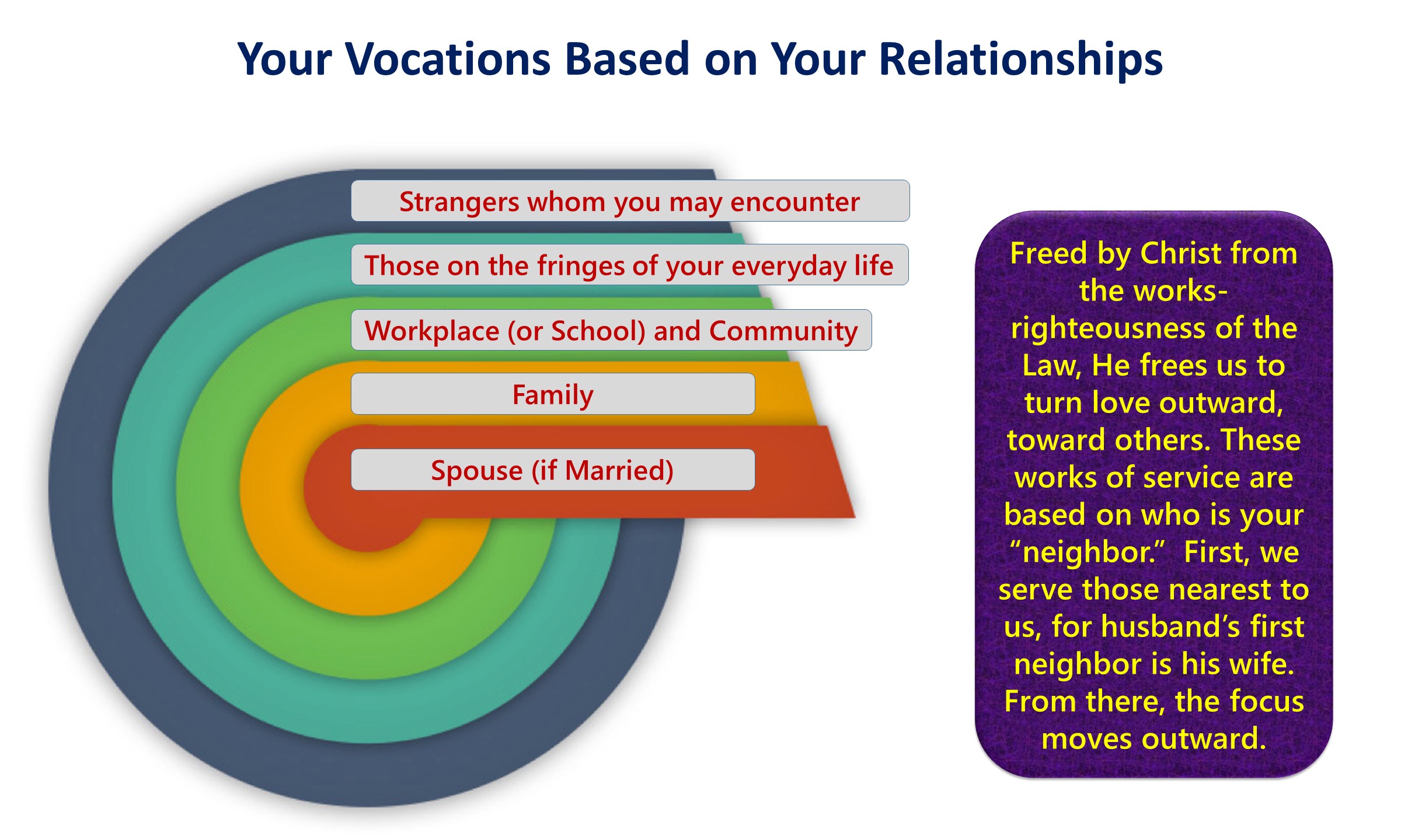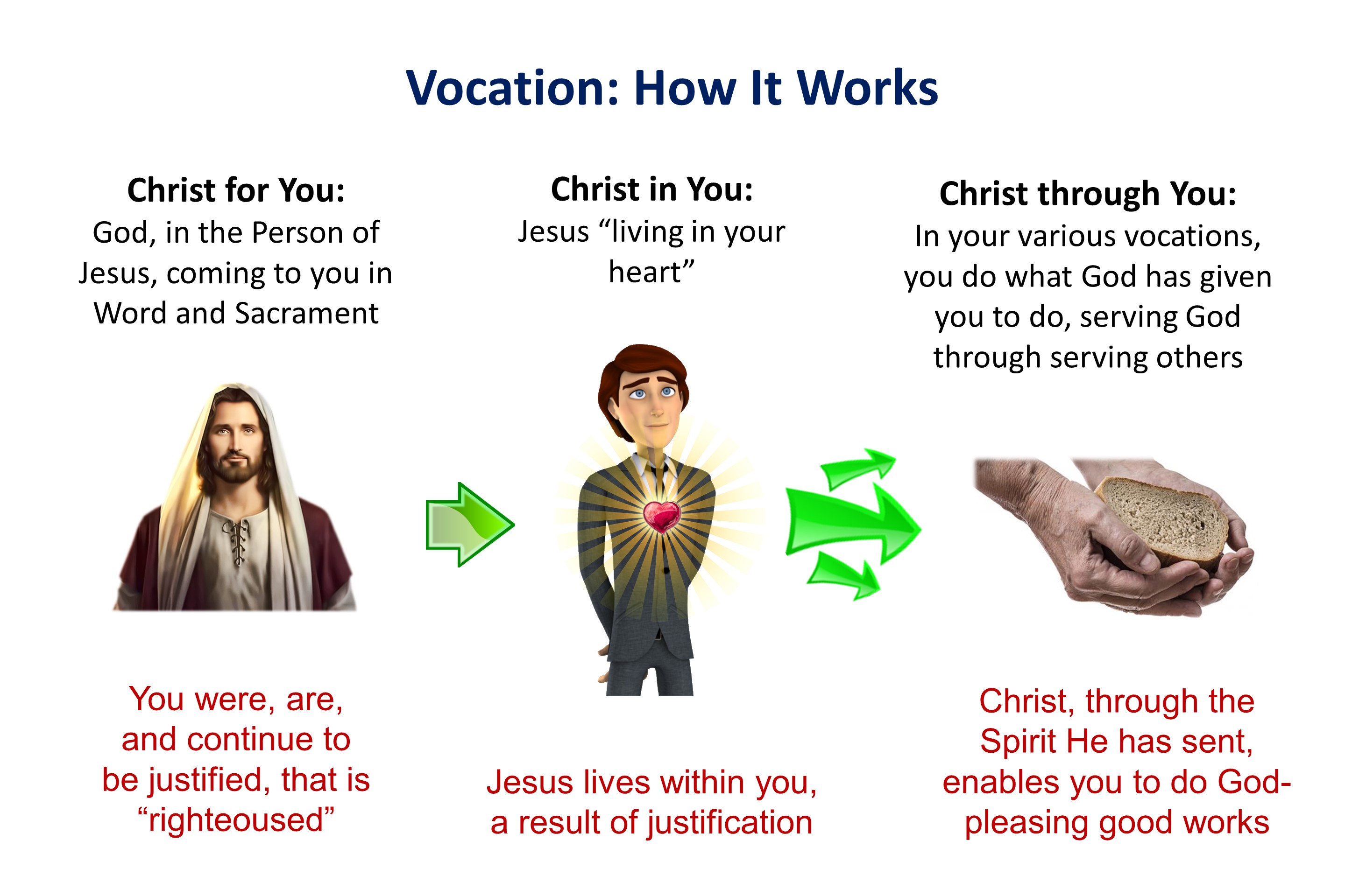 No longer needing to justify ourselves because Christ justifies us, we can live in a spirit of freedom. This freedom is focused away from our sinful self, which allows us to look beyond ourselves toward others. This is vocation, for our faith reveals itself by what we do (Ephesians 2:8-10).